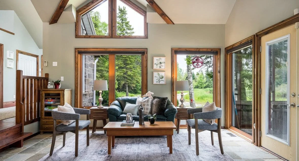 Winter brings its own kind of beauty. The pellet stove in the cozy back room is a favourite place to curl up with a book, while the side bedroom offers quiet views of the snowy landscape and surrounding forest. “It’s a home for every season.”
